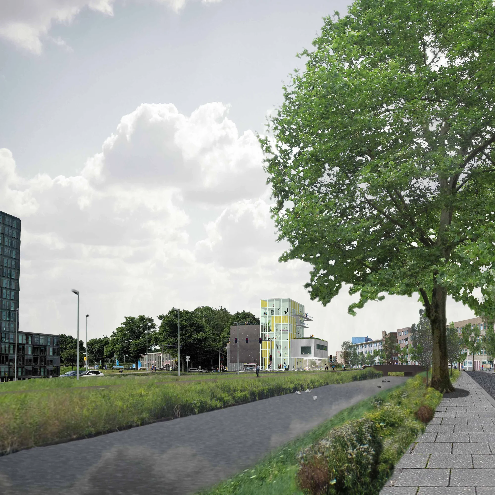 Rebellious act, Proposal intervention in the urban fabric, connecting, activating exchanging by adding new program on an existing non interesting carpark on a crossroad of three very different neighbourhoods in Amsterdam East, NL.